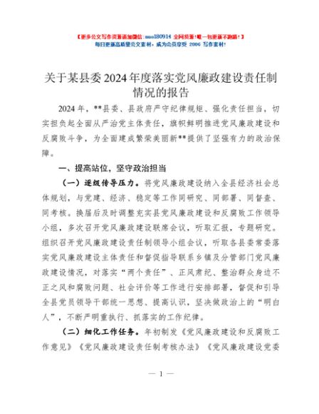 / 关于某县委2024年度落实党风廉政建设责任制情况的报告