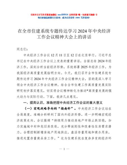 / 在全市住建系统专题传达学习2024年中央经济工作会议精神大会上的讲话