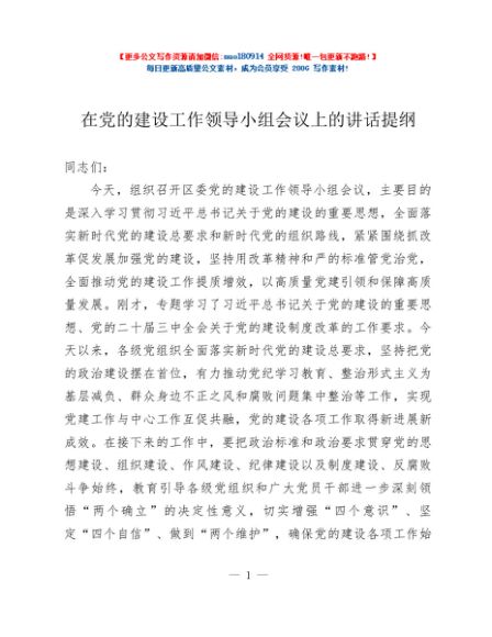 / 在党的建设工作领导小组会议上的讲话提纲