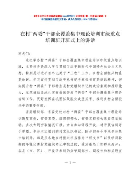 / 在村“两委”干部全覆盖集中理论培训市级重点培训班开班式上的讲话