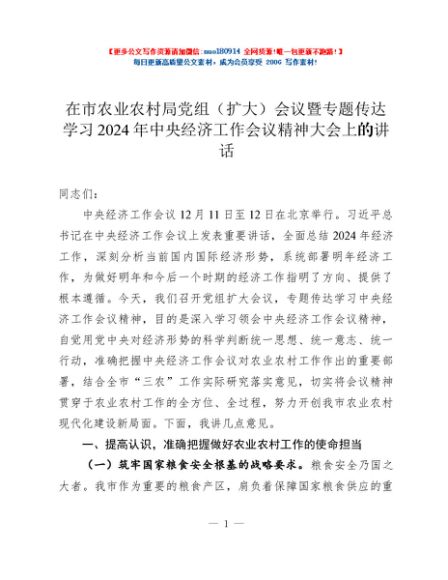 / 在市农业农村局党组(扩大)会议暨专题传达学习2024年中央经济工作会议精神大会上的讲话