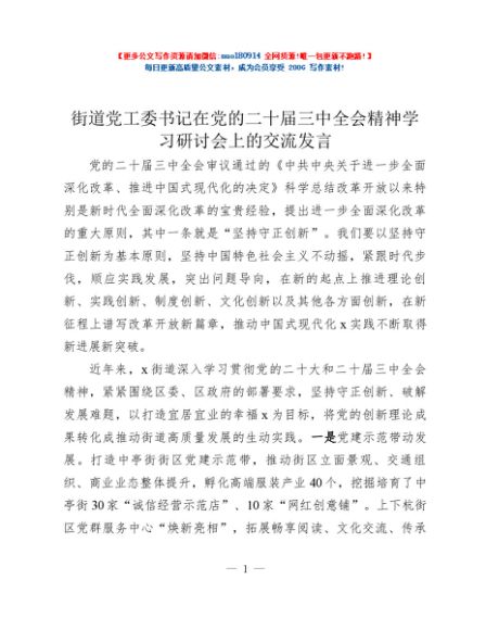 / 街道党工委书记在党的二十届三中全会精神学习研讨会上的交流发言