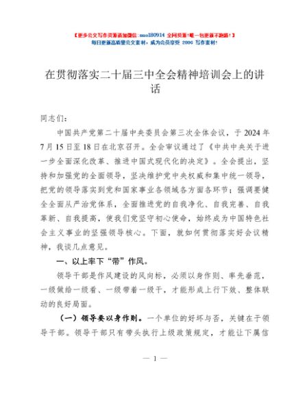 / 在贯彻落实二十届三中全会精神培训会上的讲话