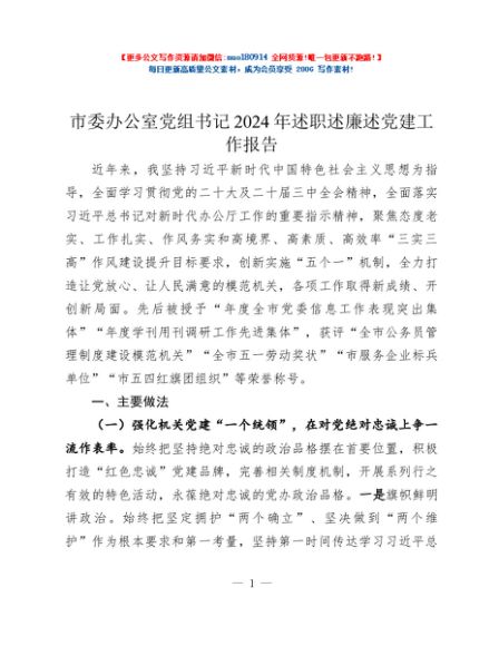 / 市委办公室党组书记2024年述职述廉述党建工作报告