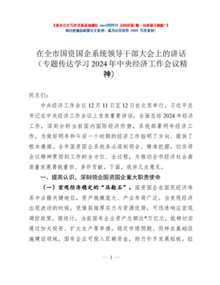 / 在全市国资国企系统领导干部大会上的讲话(专题传达学习2024年中央经济工作会议精神)