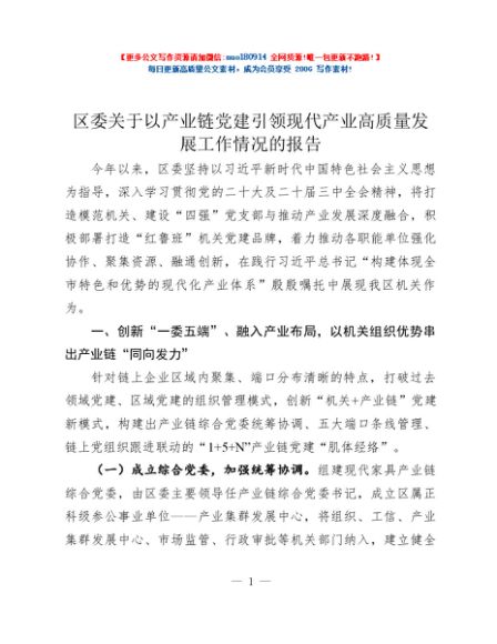 / 区委关于以产业链党建引领现代产业高质量发展工作情况的报告