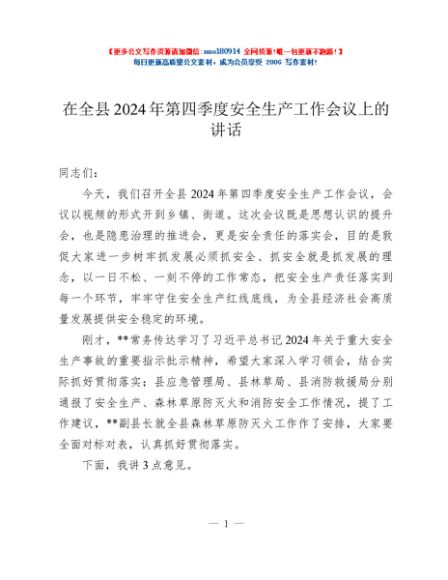/ 在全县2024年第四季度安全生产工作会议上的讲话