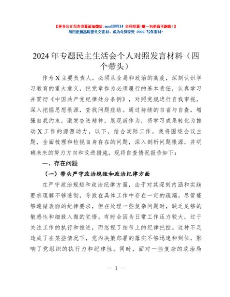 / 2024年专题民主生活会个人对照发言材料(四个带头)