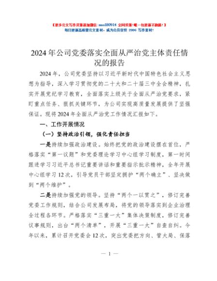 / 2024年公司党委落实全面从严治党主体责任情况的报告