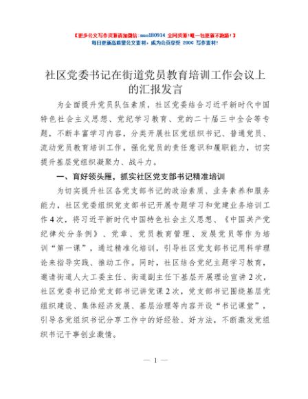 / 社区党委书记在街道党员教育培训工作会议上的汇报发言