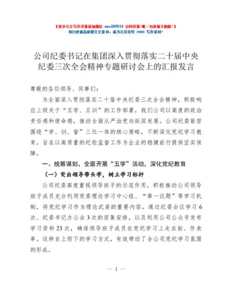 / 公司纪委书记在集团深入贯彻落实二十届中央纪委三次全会精神专题研讨会上的汇报发言