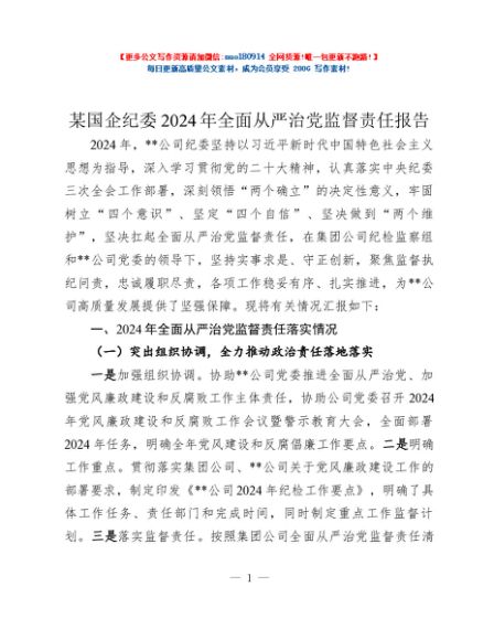 / 某国企纪委2024年全面从严治党监督责任报告