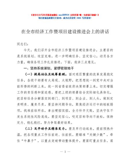 / 在全市经济工作暨项目建设推进会上的讲话