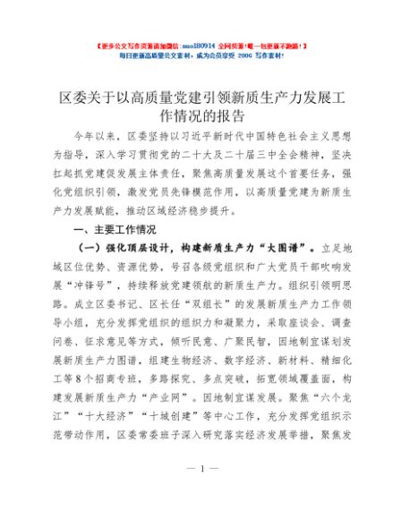 / 区委关于以高质量党建引领新质生产力发展工作情况的报告