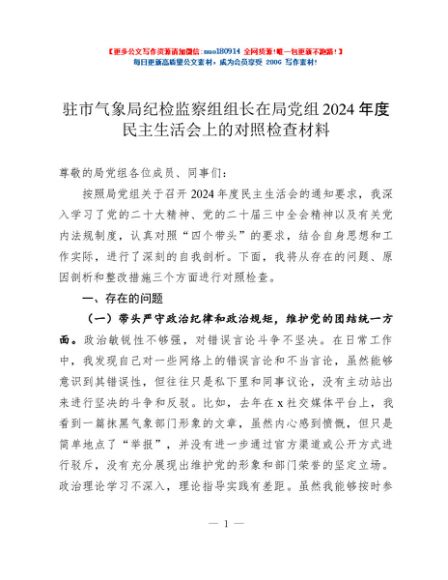 / 驻市气象局纪检监察组组长在局党组2024年度民主生活会上的对照检查材料