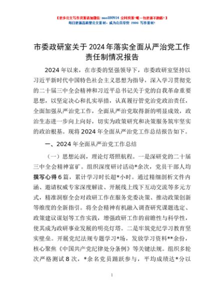 / 市委政研室关于2024年落实全面从严治党工作责任制情况报告