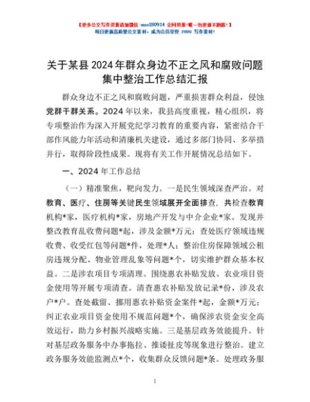 / 关于某县2024年群众身边不正之风和腐败问题集中整治工作总结汇报