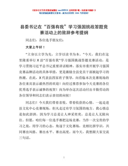 / 县委书记在“百强有我”学习强国挑战答题竞赛活动上的致辞参考提纲