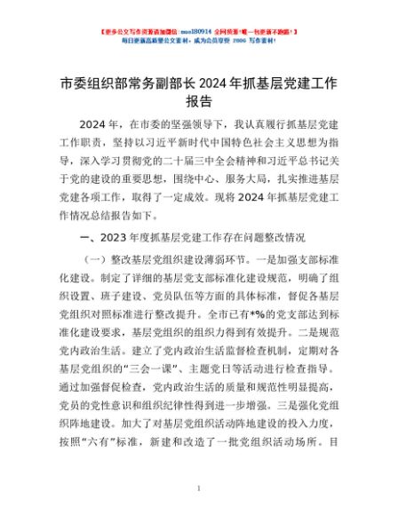 / 市委组织部常务副部长2024年抓基层党建工作报告