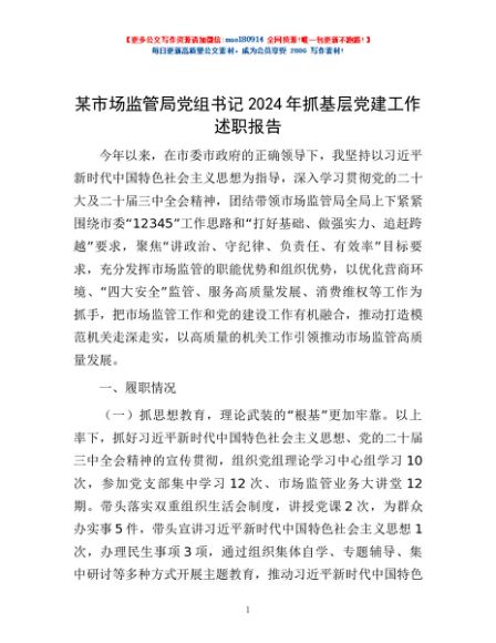 / 某市场监管局党组书记2024年抓基层党建工作述职报告