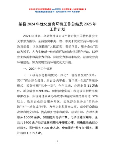 / 某县2024年优化营商环境工作总结及2025年工作计划