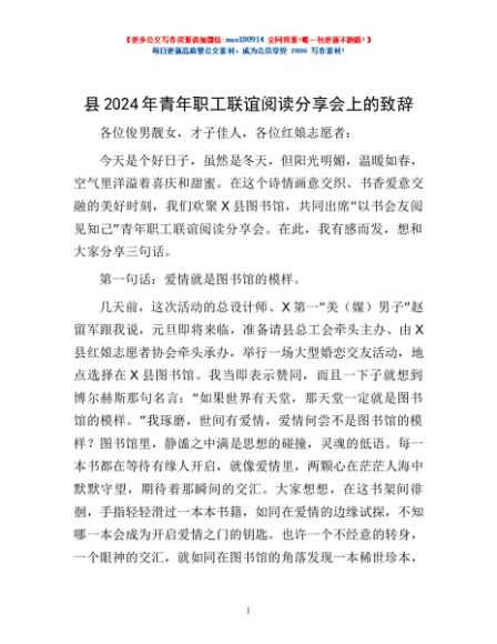 / 县2024年青年职工联谊阅读分享会上的致辞