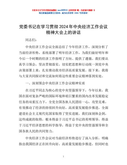 / 党委书记在学习贯彻2024年中央经济工作会议精神大会上的讲话