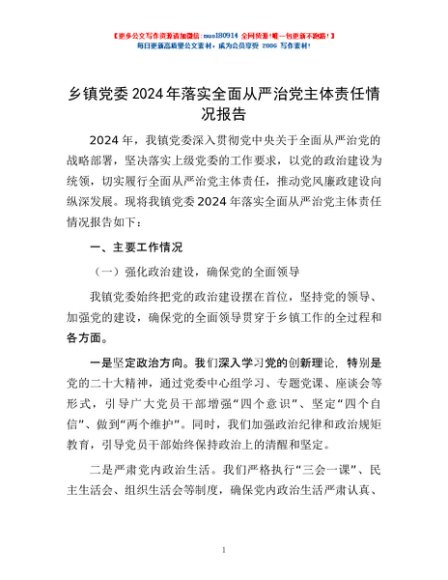 / 乡镇党委2024年落实全面从严治党主体责任情况报告