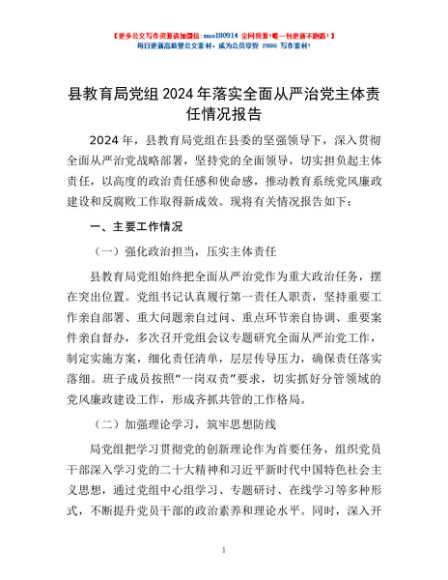 / 县教育局党组2024年落实全面从严治党主体责任情况报告
