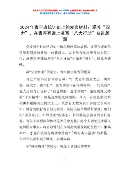 / 2024年青干班培训班上的发言材料:涵养“四力”,在青春赛道上书写“八大行动”奋进篇章