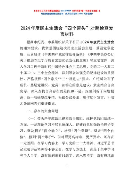 / 2024年度民主生活会“四个带头”对照检查发言材料