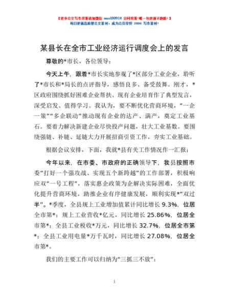 / 某县长在全市工业经济运行调度会上的发言