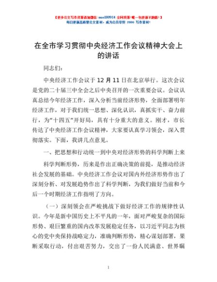 / 在全市学习贯彻中央经济工作会议精神大会上的讲话
