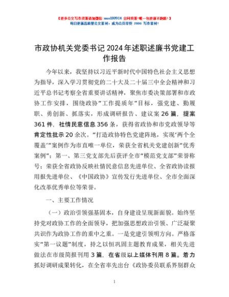/ 市政协机关党委书记2024年述职述廉书党建工作报告