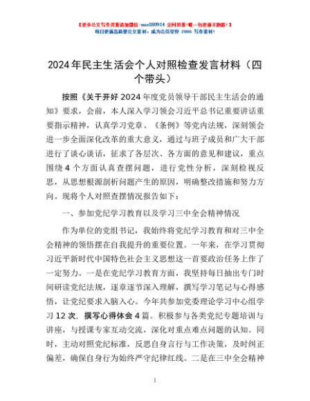 / 2024年民主生活会个人对照检查发言材料(四个带头)