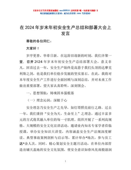 / 在2024年岁末年初安全生产总结和部署大会上发言