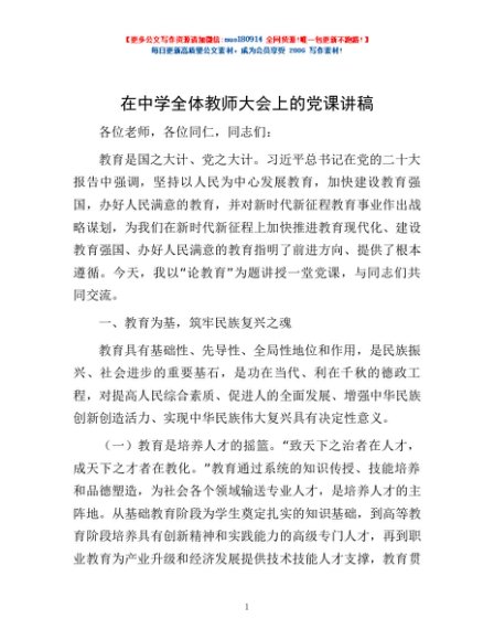 / 在中学全体教师大会上的党课讲稿