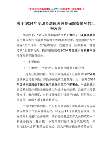 / 关于2024年度城乡居民医保参保缴费情况的汇报发言