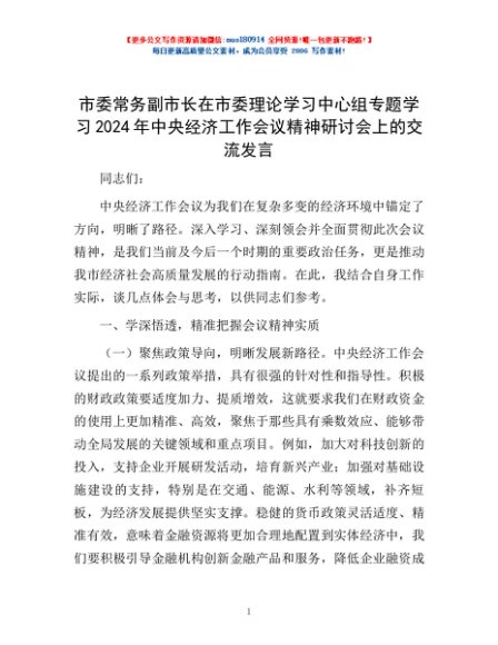 / 市委常务副市长在市委理论学习中心组专题学习2024年中央经济工作会议精神研讨会上的交流发言