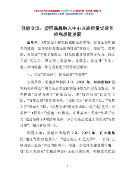 经验交流:塑强品牌 融入中心 以高质量党建引领高质量发展