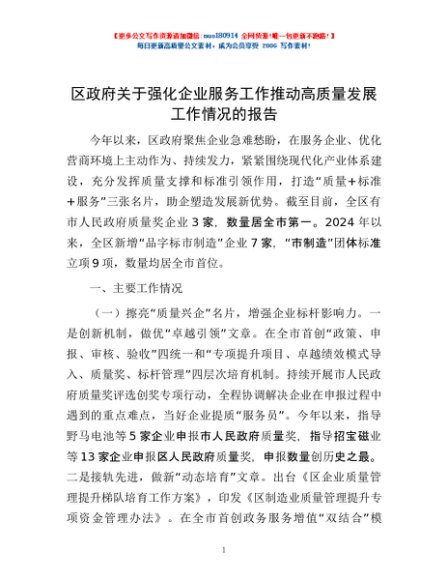 / 区政府关于强化企业服务工作推动高质量发展工作情况的报告