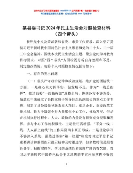 / 某县委书记2024年民主生活会对照检查材料(四个带头)