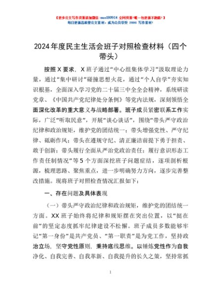 / 2024年度民主生活会班子对照检查材料(四个带头)