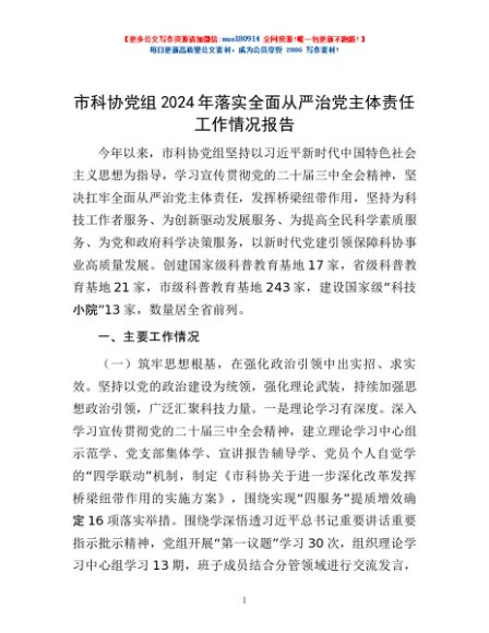 / 市科协党组2024年落实全面从严治党主体责任工作情况报告