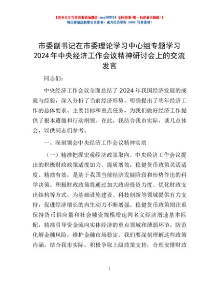/ 市委副书记在市委理论学习中心组专题学习2024年中央经济工作会议精神研讨会上的交流发言