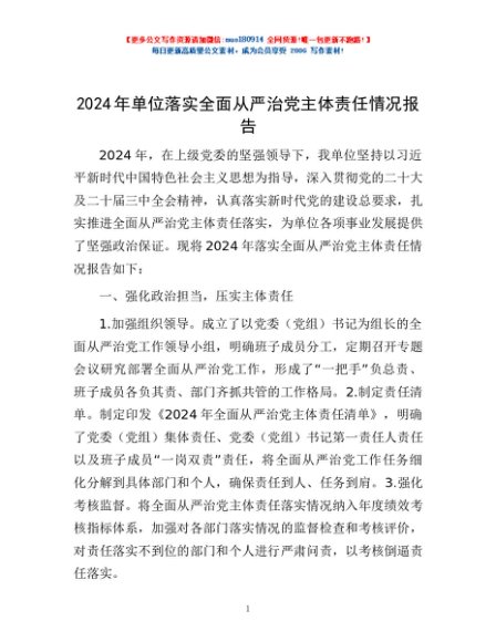 / 2024年单位落实全面从严治党主体责任情况报告