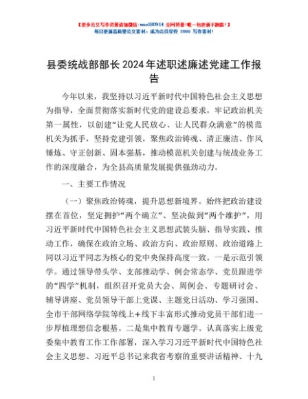 / 县委统战部部长2024年述职述廉述党建工作报告