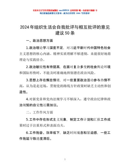 / 2024年组织生活会自我批评与相互批评的意见建议50条