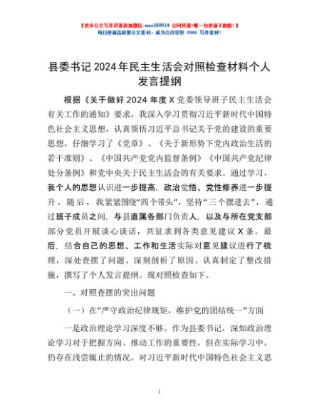 / 县委书记2024年民主生活会对照检查材料个人发言提纲