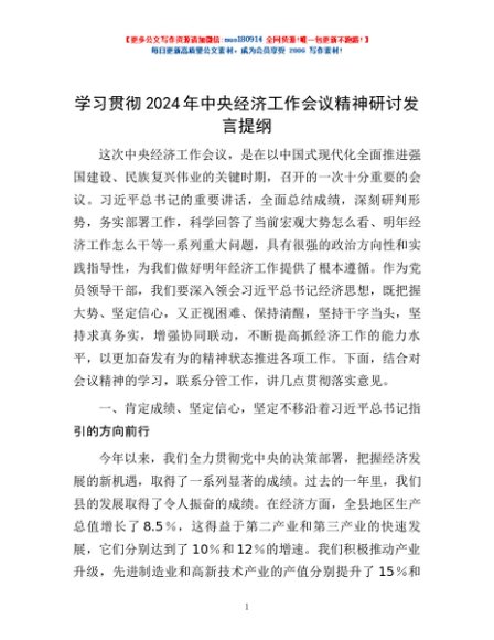 / 学习贯彻2024年中央经济工作会议精神研讨发言提纲